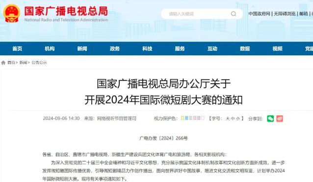 国家广播电视总局发布《关于开展2024年国际微短剧大赛的通知》。大赛共分为5个竞赛单元——“记录时代 礼赞中国”“开放合作 机遇中国”“巍巍华夏 大美中国”“创新创造 智慧中国”“创新剧本 未来中国”,全国各级广播电视播出机构、各互联网视听节目服务单位、广播电视节目制作经营机构、各影视传媒类大专院校(院系)等微短剧创作者等均可参赛。此外,“跟着微短剧去旅行”创作计划征集的作品可参与本届大赛评比。 |