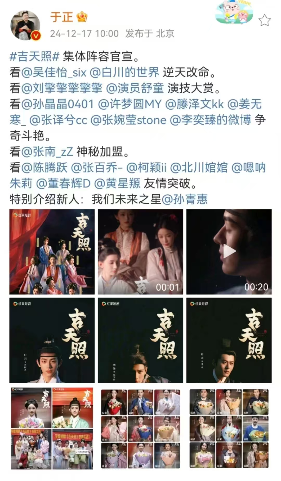 于正新短剧《吉天照》官宣将在红果春节档上线,这部剧开启了短剧宣传新模式,向电影和电视剧看齐,媒体+大V齐上阵,小编短短预计,今后短剧宣传将成为一项和院线电影宣传类似的生意。 |