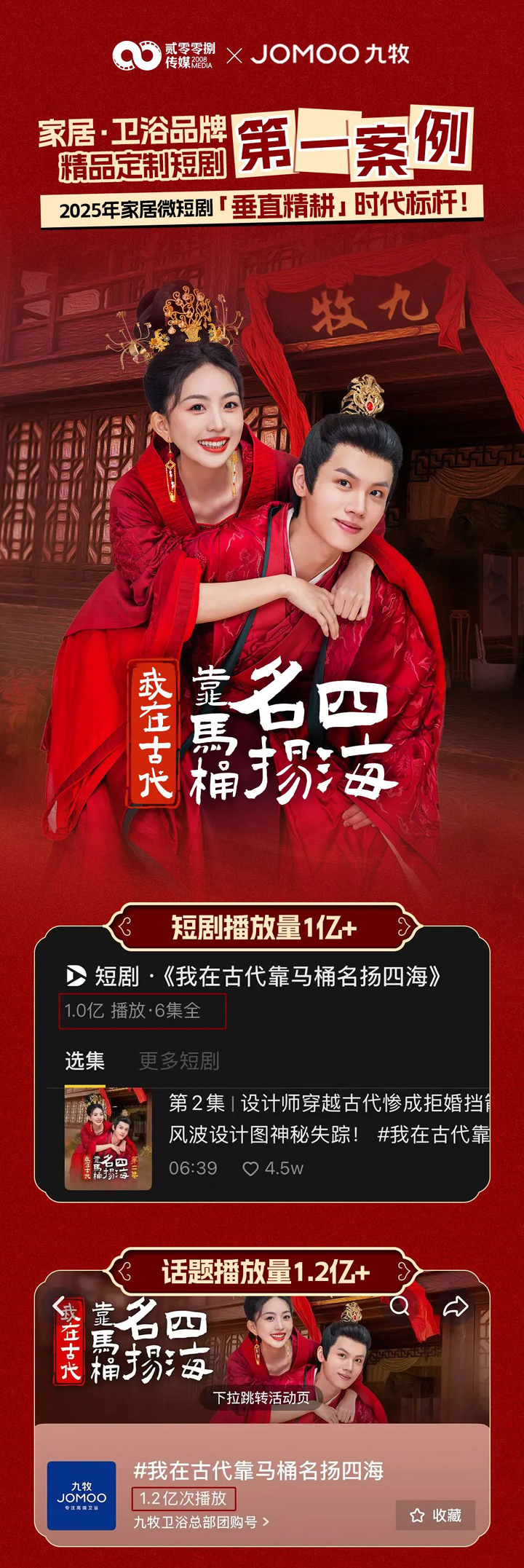 2025 年 2 月 ,九牧集团品牌赞助的卫浴行业横屏定制短剧《我在古代靠马桶名扬四海》在抖音上线。 共 6 集,上线首周播放量破 1 亿、话题播放量超 1.2 亿。该剧戏剧力较强,服化道可以达到电影级,并且有数十名群演出现的大场景。产品植入不生硬,但并未突出品牌力,种草能力较弱。演员表演水平较强。破亿的播放量可以很好的替代传统广告,整体制作、投流成本也会远低于赞助综艺。 |